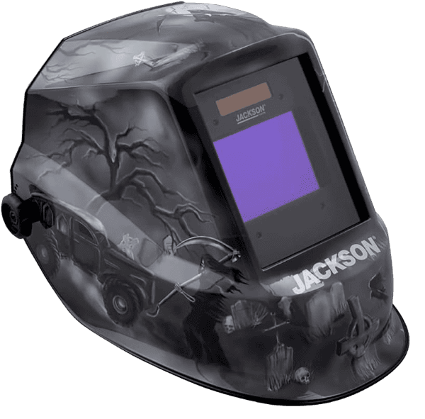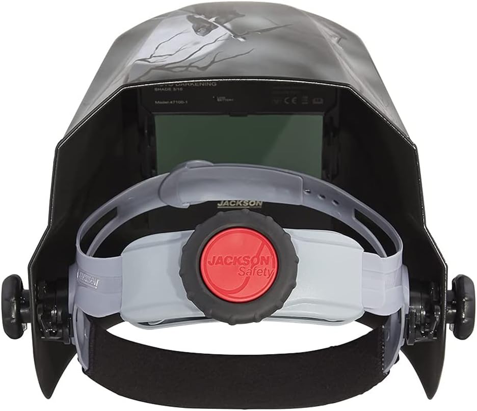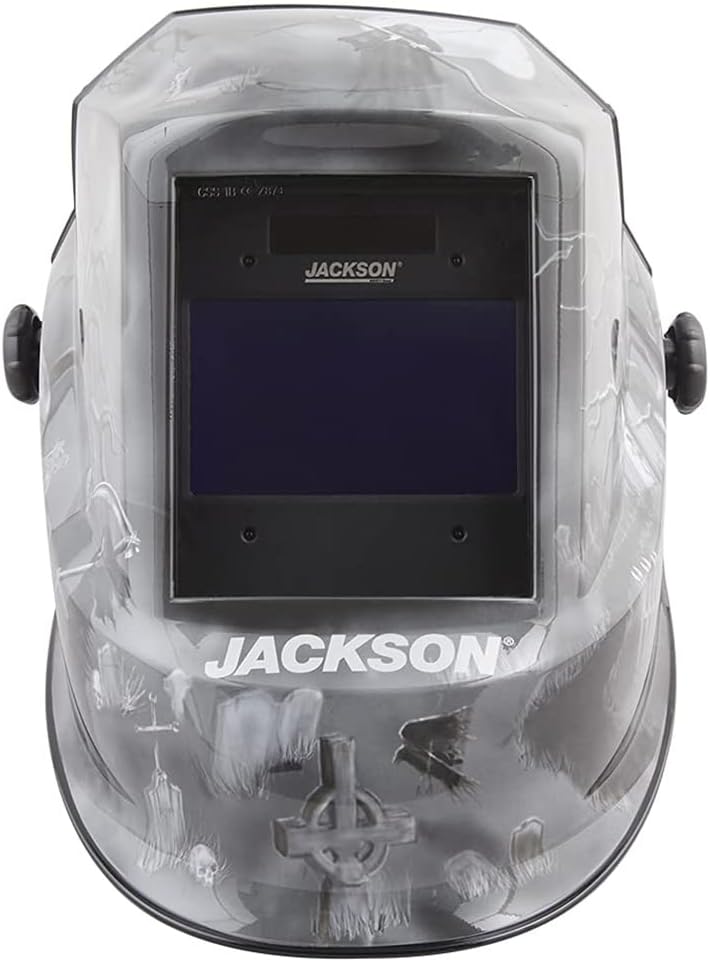 This Jackson Safety Premium Auto Darkening Welding Helmet offers 3/10 shade range and 1/1/1/1 optical clarity for maximum protection during welding. With a 1/25,000 second response time and 370 speed dial headgear, it provides quick and precise adjustments. The 6 Feet Under graphics add a touch of style to its black/grey/white design.