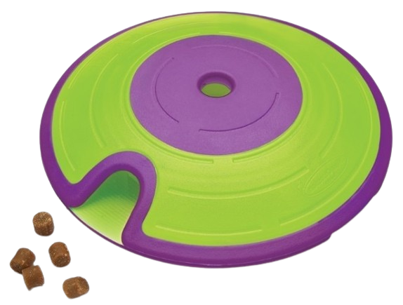 This treat dispensing dog puzzle releases treats from 2 entry points: one on each side of the saucer. Put treats or kibble in both sides of the top center hole, and watch as your dog puts it in motion to release them.