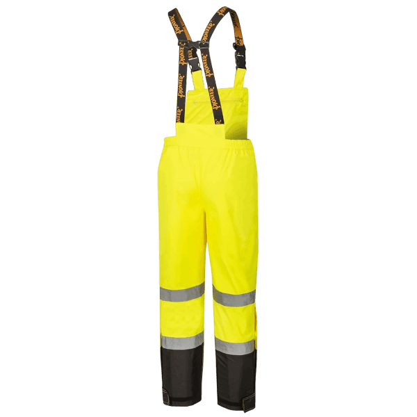 Stay safe and dry on the job with the Pioneer Ripstop High Visibility Bib Pant. These safety rain pants are made with durable ripstop fabric and feature high visibility colors and reflective strips for increased visibility. Stay protected from the rain with waterproof material and keep your work gear organized with convenient overalls design. Available in orange or yellow/green for your preference.