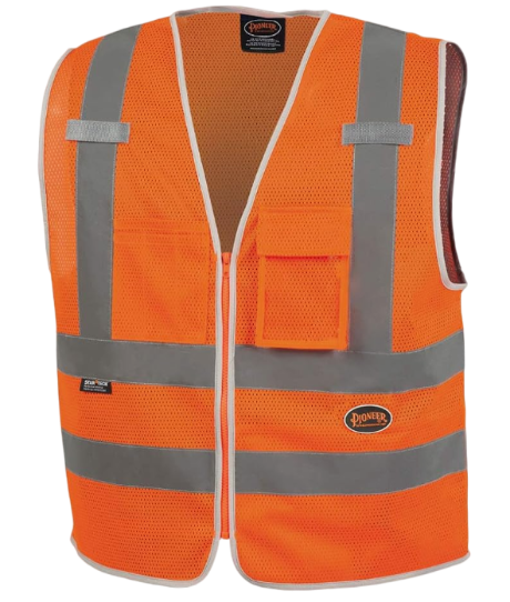 Stay safe and visible on job sites with the Pioneer Safety Vest for Men. Made with hi vis reflective mesh neon, this vest ensures you can be seen in any lighting. With 8 pockets and a zipper closure, it's perfect for construction, traffic, and security work. Available in orange or yellow/green.