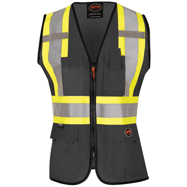Stay safe and stand out with Pioneer's Safety Vest for Women. Designed specifically for construction workers, this vest features hi-vis reflective tape for visibility and pockets for convenient storage. Keep yourself protected and organized on the job with this black vest.