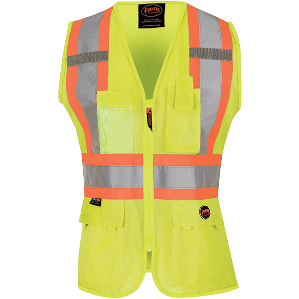 Introducing the Pioneer Safety Vest for Women, a must-have for any construction site. Stay visible and safe with the hi-vis reflective tape and conveniently store your essentials in the pockets provided. Expertly designed for women, this vest offers both function and style.