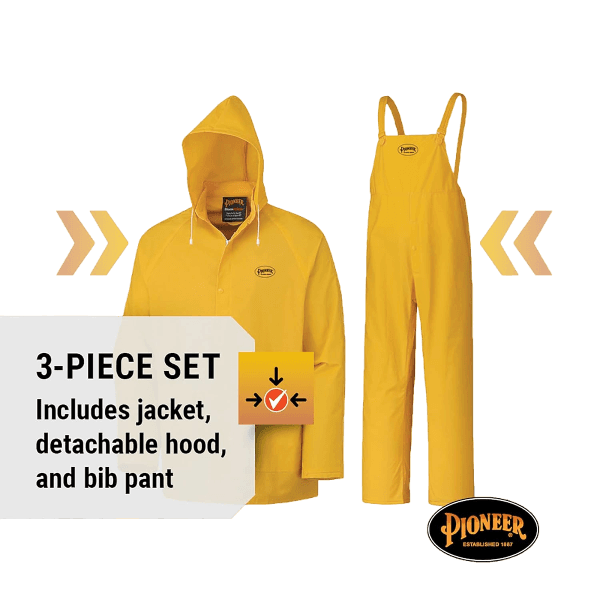 Stay dry and visible with our Pioneer Waterproof PVC Work Suit for Men. The 3-piece set includes a safety jacket and bib pants with a detectable hood. With PVC material, this work suit repels rain to keep you dry on the job. Stay protected and comfortable in any weather.