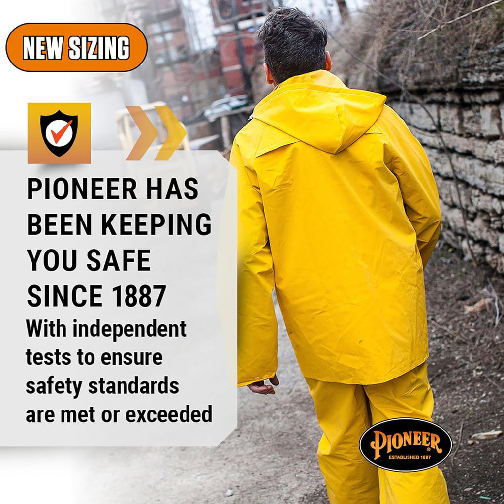 Stay dry and safe with the Pioneer Waterproof PVC Work Suit. The 3 PC set includes a yellow safety jacket and bib pants that repel rain, along with a hood for added protection. Made for men, this durable suit is perfect for outdoor work and will keep you comfortable and dry in any weather.