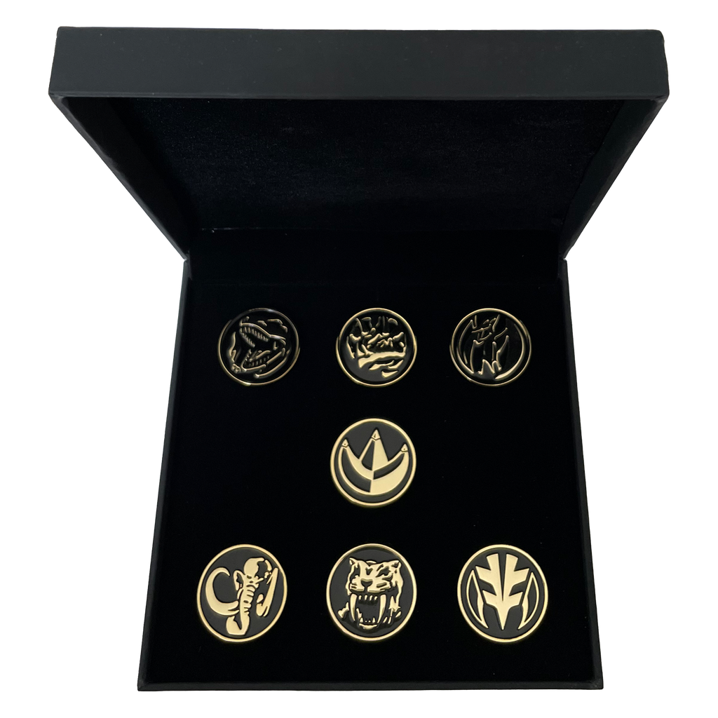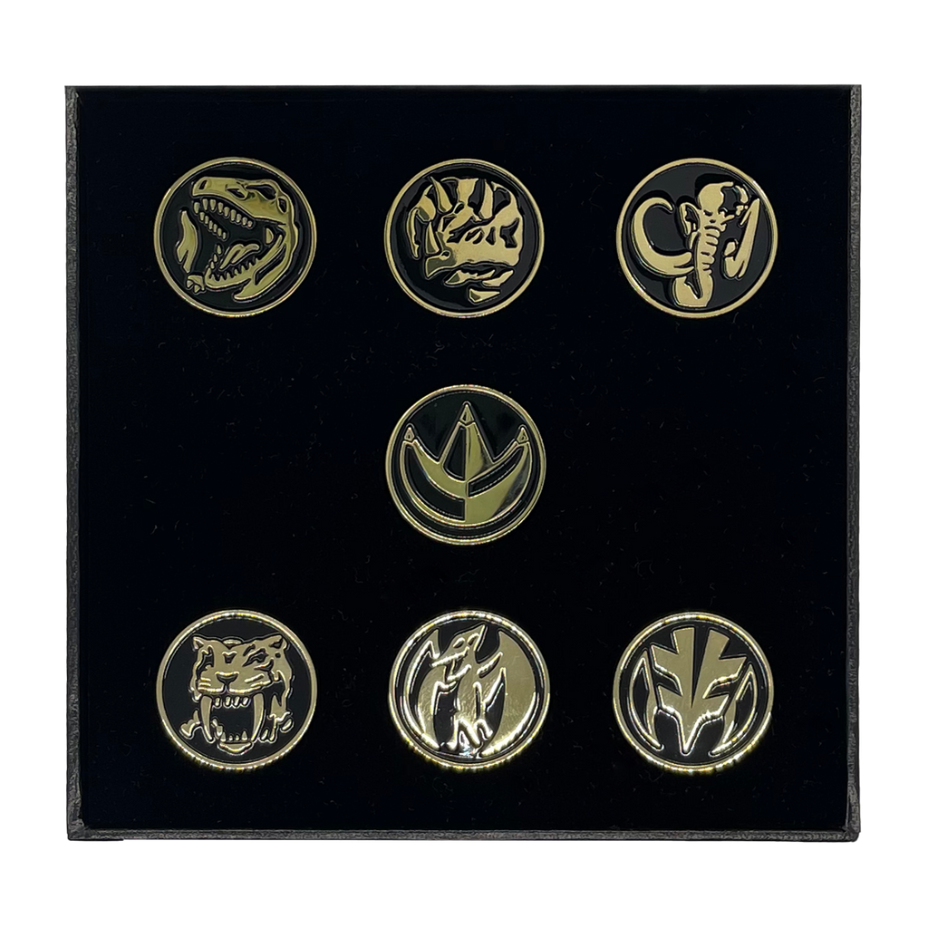 Icon Heroes presents the Power Rangers Power Coins 24K Gold Plated Pin Set featuring seven Power Coins (Green Ranger, Red Ranger, Blue Ranger, Black Ranger, Yellow Ranger, Pink Ranger, and White Ranger). These collectible pins are encased in a black collectible keepsake box with the POWER RANGERS logo printed in gold.