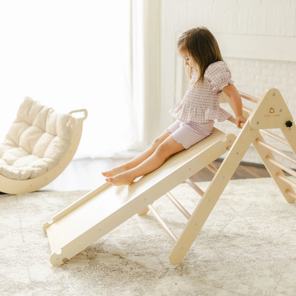 Our climbing set, with Pikler Triangle, is not just designed for the giggles. It's crafted to enhance motor skills, coordination, and confidence. It's like having your own playground that also serves as a Montessori classroom – two birds, one stone, loads of fun!