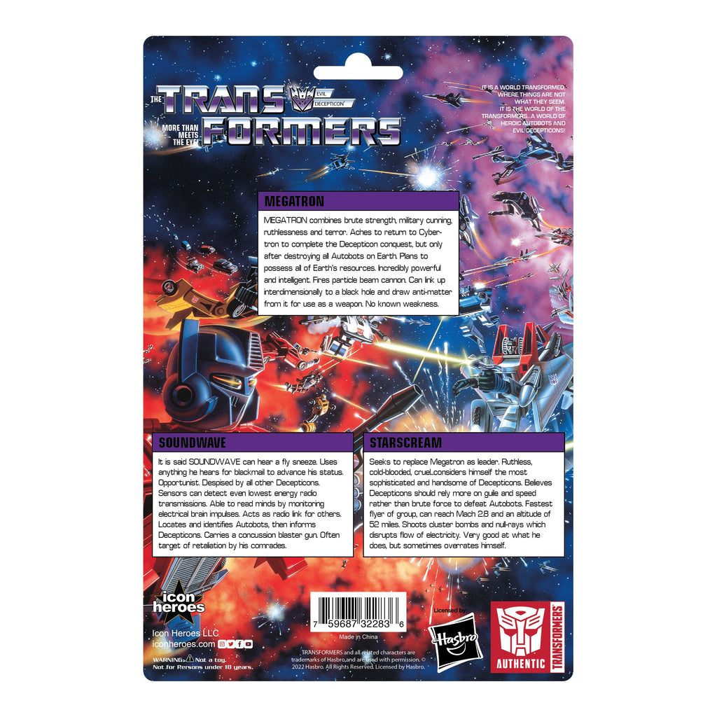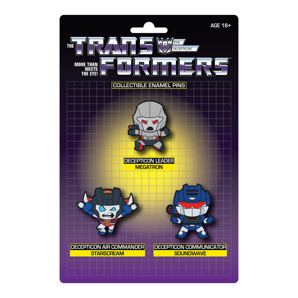 Get ready to experience total awesomeness with the Decepticons Pins Set! It's a limited edition, individually numbered collection of the greatest villains from Transformers - Megatron, Starscream, and Soundwave - brought to life in this cute (kawaii) set of pins. Let your inner geek shine and show your love for Decepticons with this must-have collection!