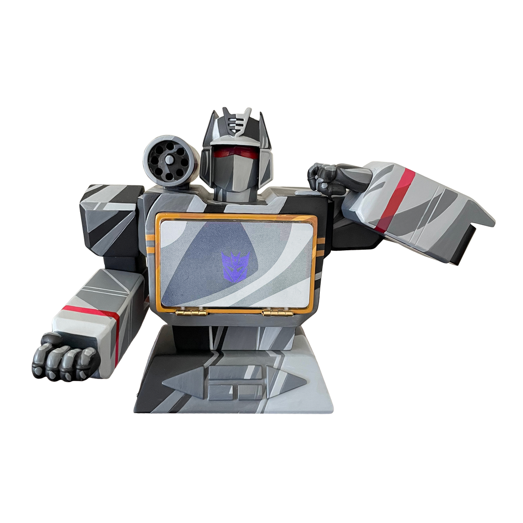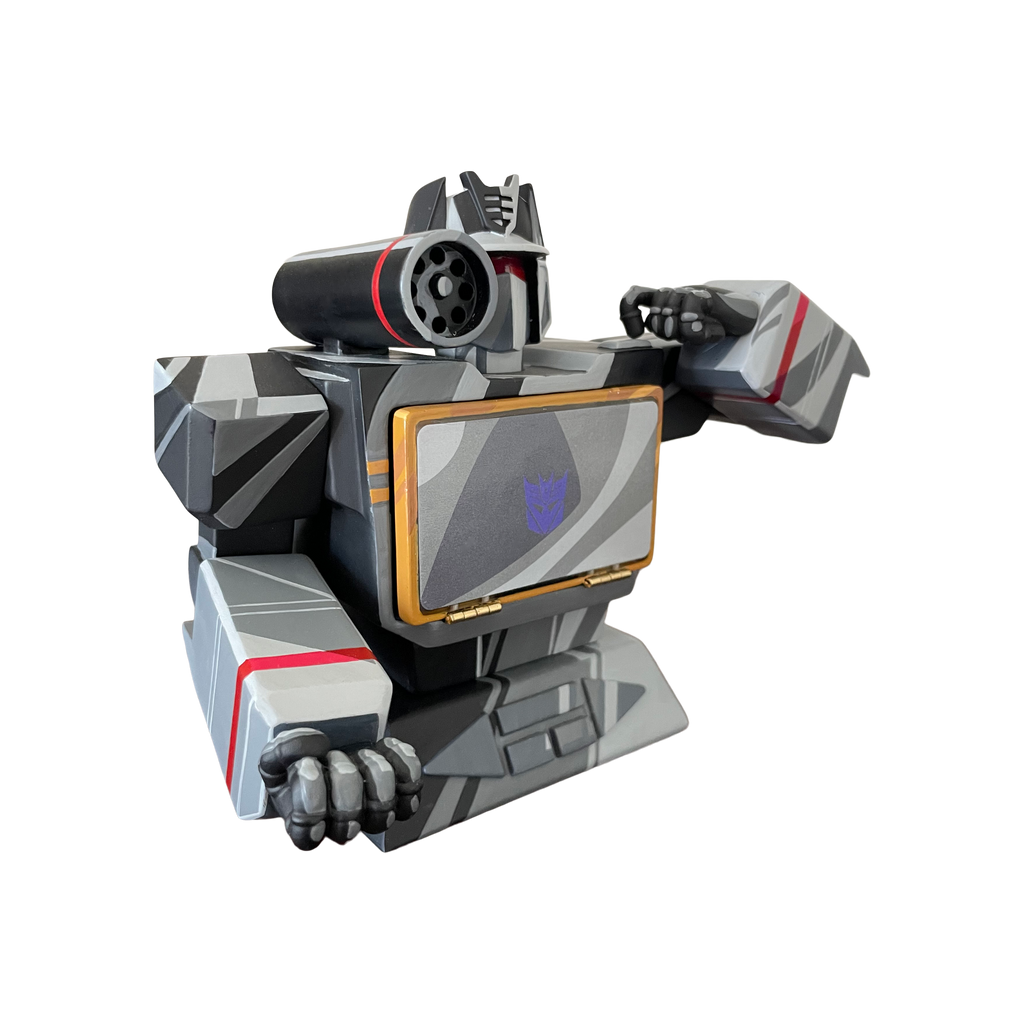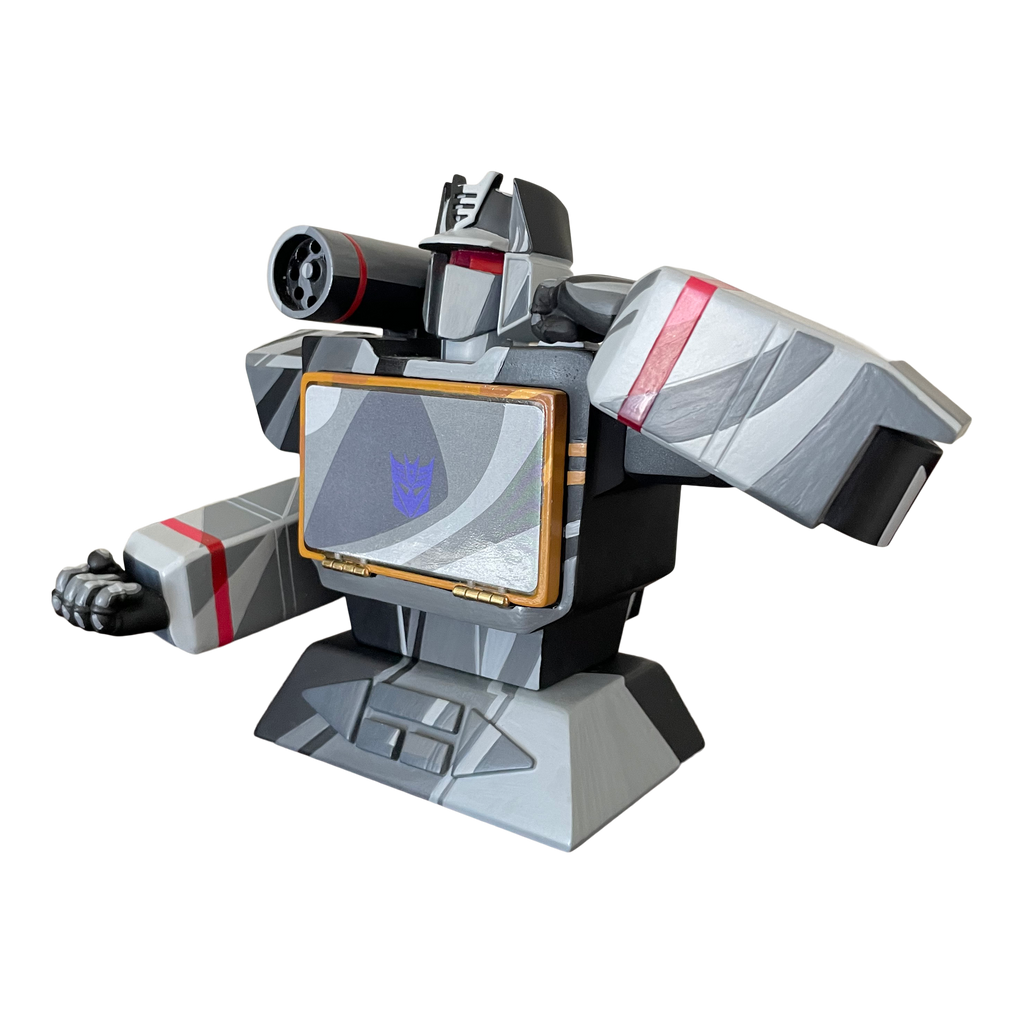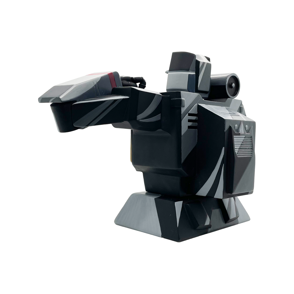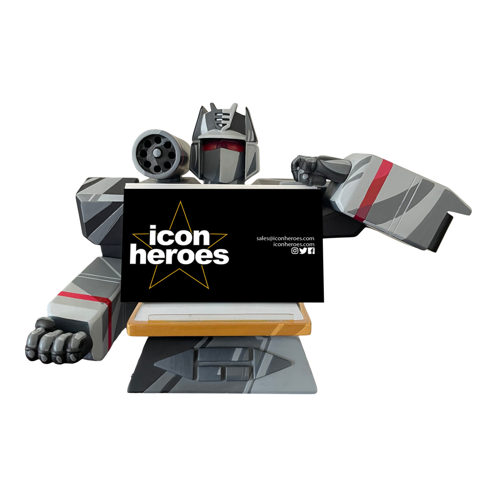 Icon Heroes presents the Transformers Soundblaster Bust Card Holder! Megatron's loyal lieutenant Soundwave died in a one-on-one battle against the Autobot Blaster but was reborn as Soundblaster by the Decepticon Headmaster leader Scorponok. Soundblaster features an intricate paint application inspired by the Transformers Generation 1 animated series. Cast in polystone, Soundblaster can hold approximately 100 cards with the tape deck flipped down. Business cards not included.